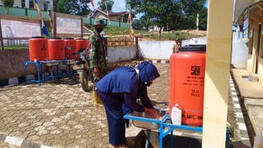 Bengkayang – Anggota Satgas TNI Manunggal Membangun Desa (TMMD) ke-111 sedang menerapkan protokol kesehatan kepada warga sebelum penyuluhan dimulai yaitu kegiatan di balai Desa Sentangau Jaya, Kecamatan Seluas, Kabupaten Bengkayang.