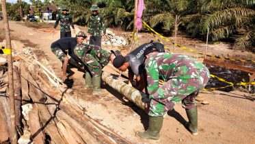 Kubu Raya – Meski nampak kelelahan tetapi personil satgas TMMD ke 111 Kodim 1207/Pontianak yang di pimpin Sertu Suryandi tetap bersemangat untuk segera menyelesaikan pembangunan jembatan darurat penghubung jalur Mega Timur-Kuala Mandor B, Sabtu (19/06/2021).