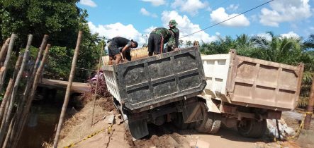 Dari pantauan, terlihat terlihat anggota Satgas TNI Manunggal Membangun Desa (TMMD) turut membantu memindahkan muatan truk tersebut ke truk yang satunya bersama warga masyarakat setempat