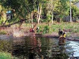 Diiringi canda tawa mereka berlompatan secara bergantian masuk ke dalam sungai. Ketika salah satu personil satgas TMMD ke-111 Kodim 1207/Pontianak Sertu Sugianto membersihkan diri menjelang waktu istirahat, teriakan anak-anak kecil itu terdengar dengan ajakan.