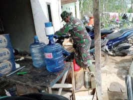 Kubu Raya – Teriknya cuaca di lokasi TMMD ke-111 Kodim 1207/Pontianak membuat personil satgas TMMD berulang kali minum. Melihat galon air dalam kondisi kosong, Baminlog segera mengambil galon lalu membawanya ke tempat pengisian air galon di jalan poros Kuala Mandor B, Minggu (27/06/2021).