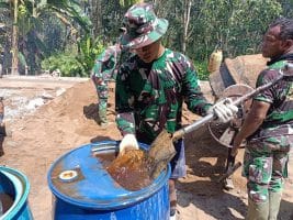Sertu Joyo yang tampak sedang membersihkan sekop mengatakan, “Setiap hari saya mencuci sekop ini setelah digunakan untuk mengaduk semen, agar tidak ada sisa-sisa semen yang menempel disini dan sekopnya bisa digunakan lagi untuk kegiatan TMMD berikutnya” ujarnya.