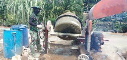 Sertu Yudi Suryanto anggota satgas yang selama ini pegang roskam/raskam kayu yang berfungsi meratakan dan menghaluskan plesteran, kali ini yang dia pegang mesin molen.