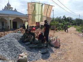Kubu Raya – Cuaca panas saat pelaksanaan TMMD ke-111 Kodim 1207/Pontianak di Desa Kuala Mandor B, Kecamatan Kuala Mandor B, Kabupaten Kubu Raya, tidak menyurutkan semangat anggota satgas dan masyarakat setempat yang sedang bekerja, Jumat (25/06/2021).