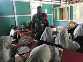 Kubu Raya – Disela waktu tugasnya pengerjaan pembangunan jalan rabat beton, anggota satgas TMMD ke-111 Kodim 1207/Pontianak Kopda Nursalim menyempatkan datang ke sekolah Madrasah Ibtidaiyah (MI) Nurul Mustaqim yang berada di Desa Kuala Mandor B untuk memberikan pemahaman tentang wawasan kebangsaan kepada pelajar yang ada disana. Pemahaman tentang wawasan kebangsaan ini merupakan salah satu sasaran non fisik TMMD ke-111 Kodim 1207/Pontianak, Kamis (24/06/2021).