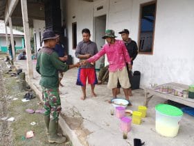 Kubu Raya – Personil satgas TMMD ke-111 Kodim 1207/Pontianak ajak warga perangi covid-19. Melalui komsos saat usai makan siang, personil satgas TMMD bagikan masker kepada warga di Pondok Pesantren Salafiyah Haqqulyaqin Assahllyyn, Dusun Maju Jaya, Desa Kuala Mandor B, Kecamatan Kuala Mandor B, Kabupaten Kubu Raya, Kamis (24/06/2021).