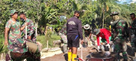 Kubu Raya – Personil satgas TMMD ke-111 Kodim 1207/Pontianak dengan percaya diri dan moril yang tinggi terus menerus menunjukkan kestabilan dalam melaksanakan kegiatan fisik rabat beton jalan di Dusun Maju Jaya, Desa Kuala Mandor B, Kecamatan Kuala Mandor B, Kabupaten Kubu Raya, Sabtu (10/07/2021).
