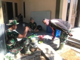 Kubu Raya – Pisang goreng dan kopi panas merupakan perpaduan yang pas untuk menemani anggota satgas TMMD saat beristirahat setelah lelah bekerja mengecor jalan rabat beton di lokasi TMMD ke-111 Kodim 1207/Pontianak di Dusun Maju Jaya, Desa Kuala Mandor B, Kecamatan Kuala Mandor B, Kabupaten Kubu Raya, Sabtu (10/07/2021).
