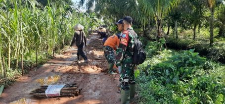 Kubu Raya – Sertu Asiani anggota satgas TMMD ke-111 Kodim 1207/Pontianak bersama warga atasi jalan yang berlubang dan berlumpur, Sabtu (10/07/2021).