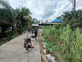 Kubu Raya – Pemasangan kabel listrik untuk menunjang alat penerangan di ruas jalan rabat beton yang baru saja selesai dibangun oleh satgas TMMD ke-111 Kodim 1207/Pontianak mendapat sambutan positif dari warga Dusun Maju Jaya, Desa Kuala Mandor B, Kecamatan Kuala Mandor B, Kabupaten Kubu Raya. Karena dengan adanya penerangan jalan ini warga merasa lebih aman ketika hendak melintasi jalan baru tersebut pada malam hari, Rabu (14/07/2021).