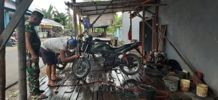 Jalan yang berlumpur dan licin, apalagi kalau habis hujan semua tanah merah yang berbaur dengan air seakan seperti bubur sangat licin. Maka tanpa perawatan sarana/alat TMMD, kemungkinan besar alat akan mudah karat dan rusak. Jadi selesai kegiatan mutlak sebelum dalam penyimpanan kondisi harus bersih, sehingga esok siap digunakan kembali. Seperti halnya satgas TMMD yang sehari-hari sebagai Babinsa ini, Serda Rahmanto selalu jaga motor dinasnya agar selau siap pada setiap kegiatan/tugasnya.