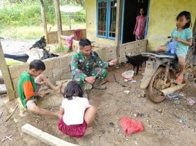 BENGKAYANG – Anggota Satgas TMMD Regtas ke-111 Kodim 1202/Singkawang, Serda Dhika mengenalkan mainan tradisional tembakan pletokan kepada anak-anak di lokasi TMMD di Desa Sentangau Jaya Jalan Trans Segorong Kecamatan Seluas Kab Bengkayang.
