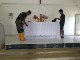 Bengkayang – Sebagai wujud toleransi antar umat beragama dan kepedulian terhadap kesehatan warga, anggota satgas TMMD membantu warga membersihkan tempat ibadah yaitu Gereja St Kristoforus di Desa Sentangau Jaya, Kecamatan Seluas, Kabupaten Bengkayang.