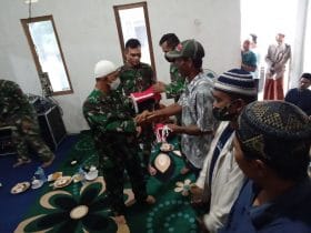 Kubu Raya – Pak Miskan selaku ketua RT 04 di Dusun Maju Jaya, Desa Kuala Mandor B, Kecamatan Kuala Mandor B, Kabupaten Kubu Raya, menerima bendera merah putih dalam program TMMD ke-111 Kodim 1207/Pontianak, Kamis (15/07/2021).