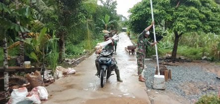Tampak Serda Budi Harsono bersama anggota satgas lainnya sebelum meninggalkan lokasi TMMD ke-111 Kodim 1207/Pontianak mendistribusikan tiang bendera kerumah warga setempat dengan menggunakan sepeda motor.