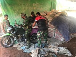 Pratu Faisal bersama anggota dari TNI AU yang sedang BKO membantu kegiatan TMMD ke-111 Kodim 1207/Pontianak tampak sedang menaikkan material semen ke motor dinas untuk dibawa ke mesin molen.