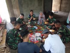 Kubu Raya – Walaupun kegiatan TMMD ke-111 Kodim 1207/Pontianak sudah selesai, hubungan silahturahmi antara TNI dan warga harus tetap terjaga. Khususnya dengan orang tua asuh yang selama 1 bulan ini rumahnya sudah ditempati oleh anggota satgas. Hal ini ditandai dengan makan bersama antara keluarga bapak Tamtomo sebagai pemilik rumah dengan beberapa orang anggota satgas TMMD yang tinggal di rumah tersebut, Sabtu (17/07/2021).