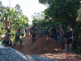 Nampak dari pagi sampai sore anggota satgas TMMD dibantu warga secara bahu membahu melakukan pengecoran jalan. Material tumpukan pasir yang menggunung dalam sekejap habis diangkut untuk dijadikan adukan. Tanpa kenal lelah tangan anggota satgas terus menyekop pasir, sebagian ada yang mengangkat dengan arco.