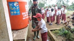 Kegiatan hari kedua puluh sembilan, Anggota Satgas TMMD ke 111 Kodim 0212/TS, hari terakhir TMMD, mengajarkan kepada anak anak bagaimana mematuhi Prokes di Dusun Paten, Desa Siuhom, Kec. Angkola Barat Kab. Tapanuli Selatan