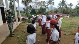 Anggota Satgas TMMD ke 111 Kodim 0212/TS, hari terakhir TMMD, mengajakan kepada anak anak bagaimana mematuhi Prokes di Dusun Paten, Desa Siuhom, Kec. Angkola Barat Kab. Tapanuli Selatan.
