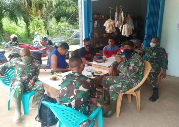 Kubu Raya – Meskipun TMMD sudah selesai, prajurit TNI yang tergabung dalam satgas TMMD ke-111 Kodim 1207/Pontianak tetap melakukan komunikasi dengan warga di warung kopi di Dusun Maju Jaya yang berjarak tak jauh dari lokasi sasaran, Minggu (18/07/2021).