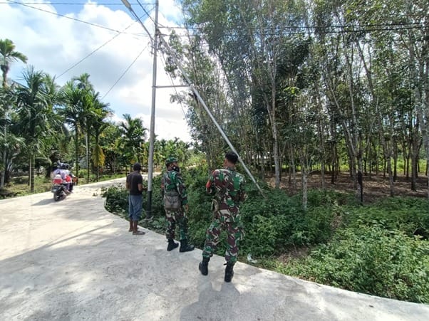 Kubu Raya – Kondisi ranting pohon yang menggangu kabel listrik dan penerangan jalan yang baru terpasang di sepanjang jalan Dusun Maju Jaya sangat membahayakan apalagi saat ini curah hujan disertai angin sangat tinggi. Sebelum pamit pulang personil satgas TMMD ke-111 Kodim 1207/Pontianak berjalan di sepanjang jalan Dusun Maju Jaya untuk cek fisik apakah ada kerusakan pada jalan yang baru saja selesai dikerjakan dan ajak warga untuk memotong pohon atau dahan pohon yang mengganggu kabel listrik dan penerangan jalan, Minggu (18/07/2021).
