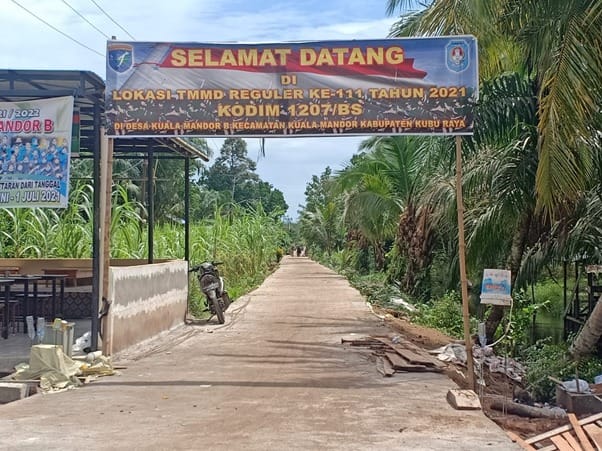 Kubu Raya – TMMD ke-111 Kodim 1207/Pontianak usai sudah, penutupan sebagai tanda rampungnya pembangunan infrastruktur cor jalan di Dusun Maju Jaya, Desa Kuala Mandor B, Kecamatan Kuala Mandor B, Kabupaten Kubu Raya pun sudah dilaksanakan. Maka tak heran kegiatan yang melibatkan personel TNI dan warga dalam membuat pengecoran jalan kini sudah tak tampak lagi, Minggu (18/07/2021).
