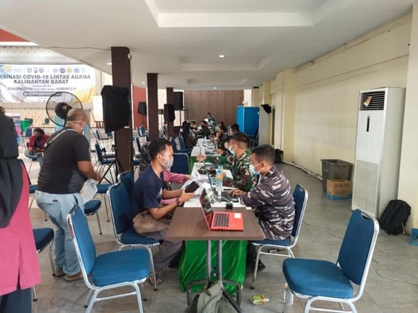 Pontianak – Mengingat kasus positif covid-19 yang semakin meningkat di masyarakat, pemerintah daerah Provinsi Kalimantan Barat masih tetap gencar melaksanakan kegiatan vaksinasi gratis untuk masyarakat Pontianak. Dalam hal ini, anggota satgas TMMD yang baru saja selesai melaksanakan kegiatan TMMD ke-111 Kodim 1207/Pontianak di Desa Kuala Mandor B siap mendukung dan mengawal ketat program pemerintah daerah tersebut. Salah satunya adalah kegiatan vaksinasi covid-19 lintas agama yang dilaksanakan di aula Universitas Muhammadiyah Pontianak, Minggu (18/07/2021).