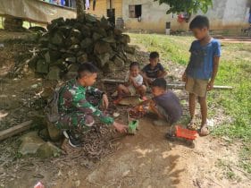 Bengkayang – Di sela-sela tugas TMMD ke-111 Kodim 1202/Skw, di Desa Sentangau Jaya, Kecamatan Seluas, Kabupaten Bengkayang, para anggota Satgas TMMD terus jalan kedekatan, dengan anak-anak di desa sasaran.