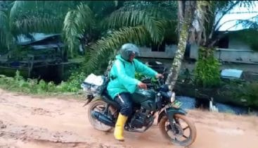 Sertu Bakti Uswanto anggota satgas TMMD ke-111 Kodim 1207 Pontianak dengan berbekalkan jas hujan plastik berangkat menuju sasaran TMMD untuk sepenuhnya mendukung kegiatan TNI jajaran Kodim 1207/Pontianak.