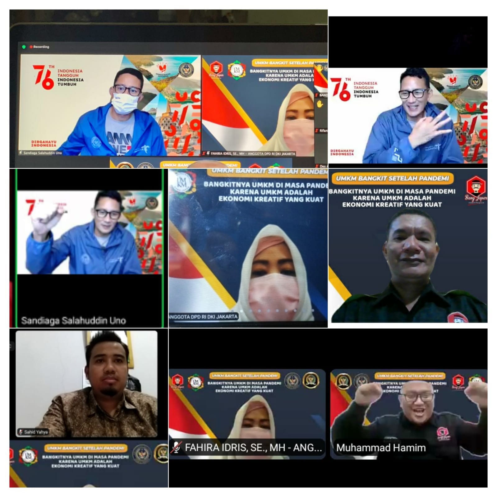 Melihat situasi seperti ini tak lepas perhatian dari Menteri Pariwisata dan Ekonomi Kreatif RI Bang Sandiaga Uno dan Anggota DPD RI Dapil Provinsi DKI Jakarta, Ibu Fahira Idris untuk membangkitkan semangat para pelaku UMKM di Indonesia dengan menggelar pertemuan secara Virtual (Zoom) bertemakan Bangkitnya UMKM dimasa Pandemi Covid-19 di Indonesia, karena UMKM adalah Ekonomi Kreatif yang kuat”, Kamis (5/8/2021) dimulai pukul 19.00 WIB.