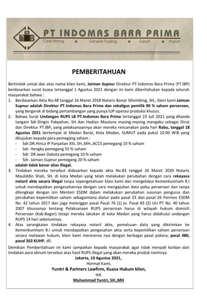 Jakarta, Nusantarapos – Yuntri & Partners Lawfirm, Kuasa Hukum Jaiman Supnur Direktur PT. Indomas Bara Prima (PT. IBP) berdasarkan surat kuasa tertanggal 1 Agustus 2021 dengan ini memberitahukan kepada seluruh masyarakat