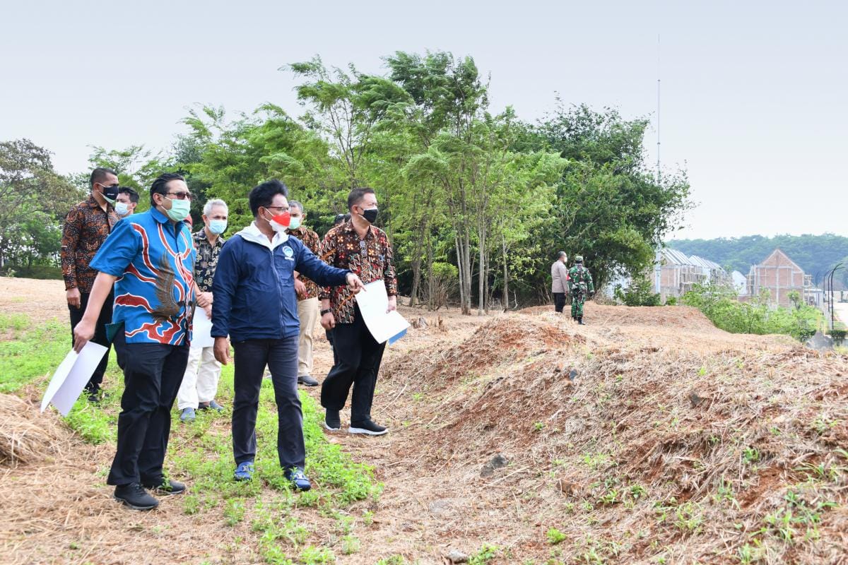 Dalan kunjungan ke lokasi lahan pembangunan BBPPT yang baru, Menteri Johnny didampingi Direktur Jenderal SDPPI Ismail dan Kepala Balai Besar Pengujian Perangkat Telekomunikasi Tony Tovik Hidayat. (Rilis)