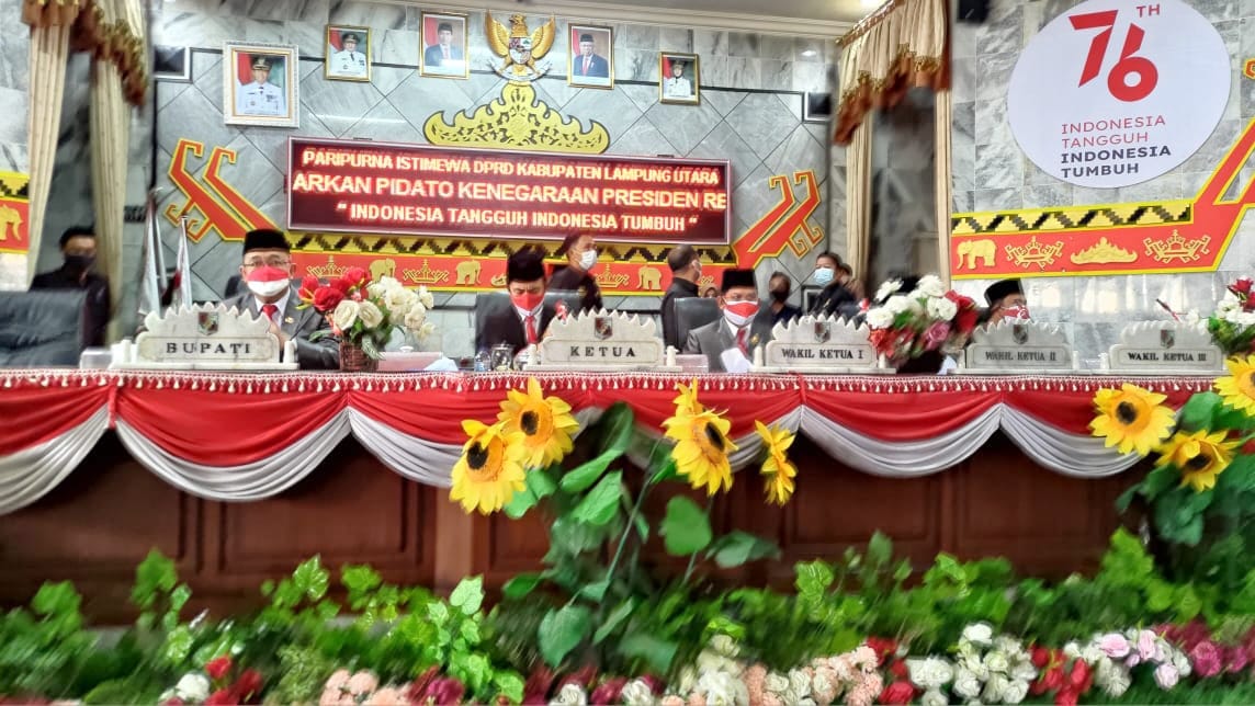 Lampung Utara, Nusantarapos – Peringati Hari Ulang Tahun Republik Indonesia Ke-76, DPRD Kabupaten Lampung Utara (Lampura) adakan Sidang Istimewa dalam agenda mendengarkan Pidato Kenegaraan. Senin (16/8/2021).