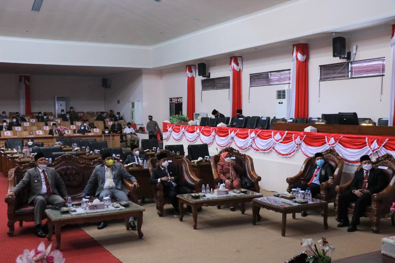 Pidato kenegaraan Presiden Republik Indonesia Joko Widodo dalam rangka peringatan Hari Ulang Tahun Republik Indonesia ke-76 tahun 2021 yang ditayangkan langsung lewat siaran TV nasional, diikuti Bupati Tanjab Barat dalam rapat Paripurna yang diselenggarakan di Gedung DPRD Tanjab Barat pada Senin 16 Agustus 2021.