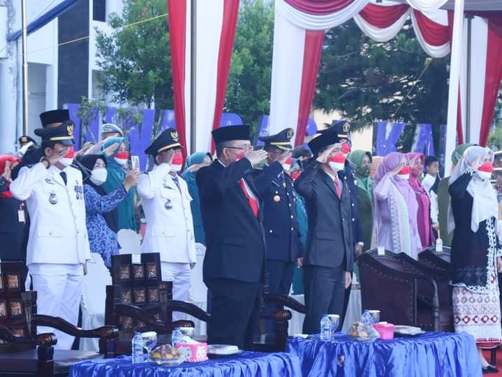 Lampung Utara, Nusantarapos – Ketua DPRD Kabupaten Lampung Utara (Lampura) bersama pemerintah daerah menghadiri Upacara Pengibaran Bendera sangsaka Merah Putih dalam rangka HUT Ke-76 Kemerdekaan Republik Indonesia yang dilaksanakan di halaman kantor Pemda setempat, Selasa (17/8/2021).