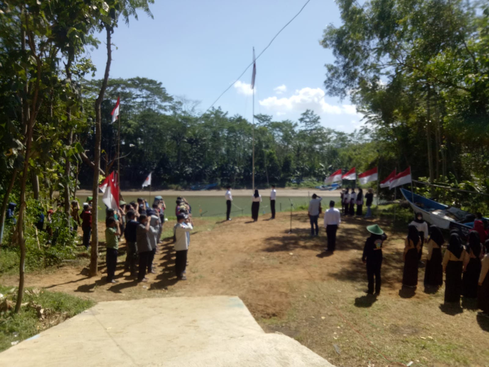 Terlihat antusias warga berinisiatif mengadakan upacara dipinggir sungai pada titik yang dianggap sakral. Acara dimulai dengan Pengibaran Bendera Merah Putih, Mengheningkan cipta, Pembacaan Teka Proklasmasi, Pancasila dan Pembacaan UUD 45, masing – masing dilakukan oleh warga Dusun Kiteran yang ditunjuk. Dilanjutkan menyanyikan lagu 17 Agustus, Halo – Halo Bandung dan diakhiri dengan doa.