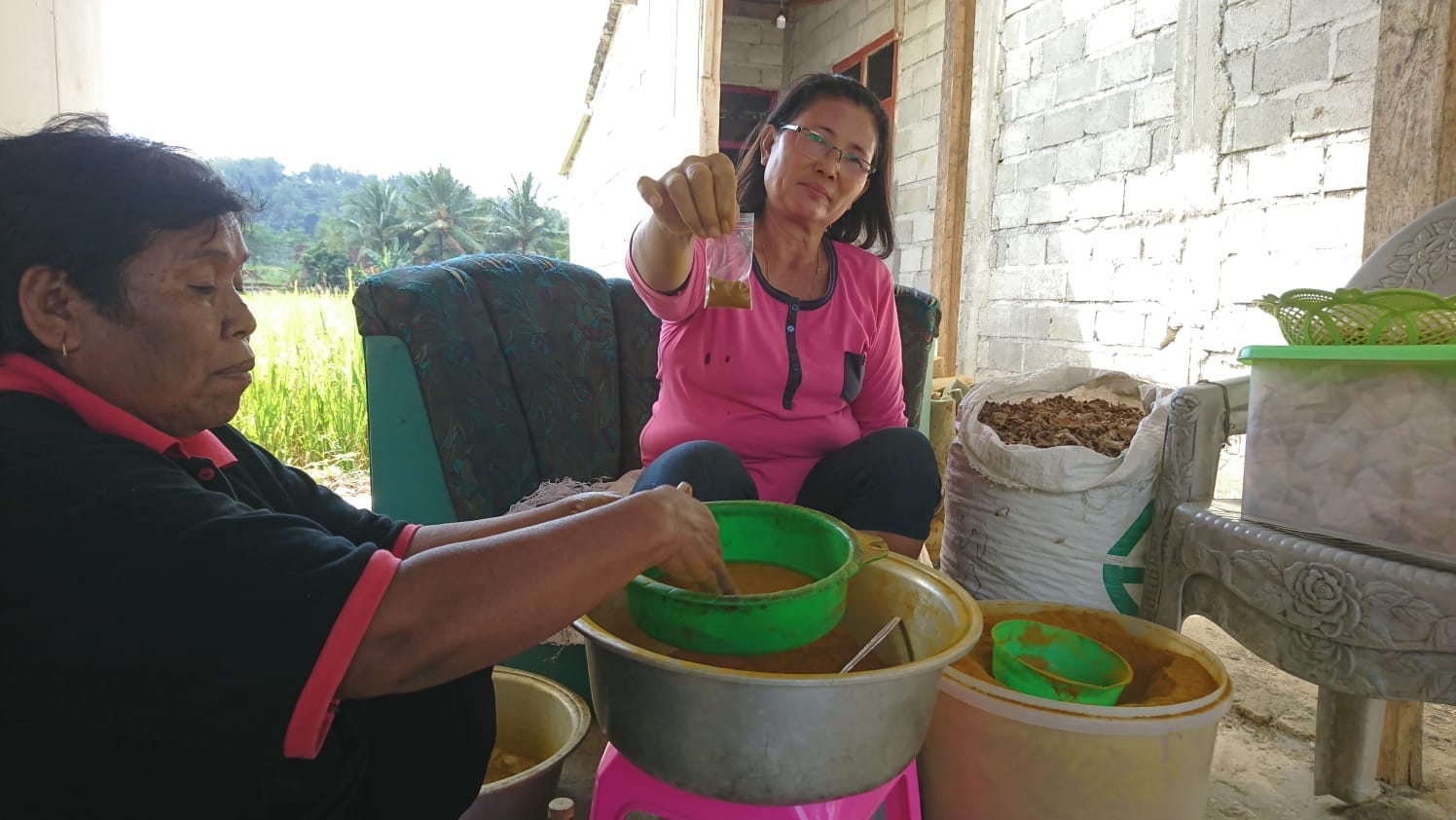 Setelah itu, ketika akan melakukan pengemasan campuran empon-empon yang telah halus tersebut dicampur dengan bubuk sangrai cacing yang telah disiapkan.