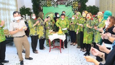 Ketua Umum PP IPPAT Dr. Hapendi Harahap sedang memotong tumpeng disaksikan jajaran pengurus.