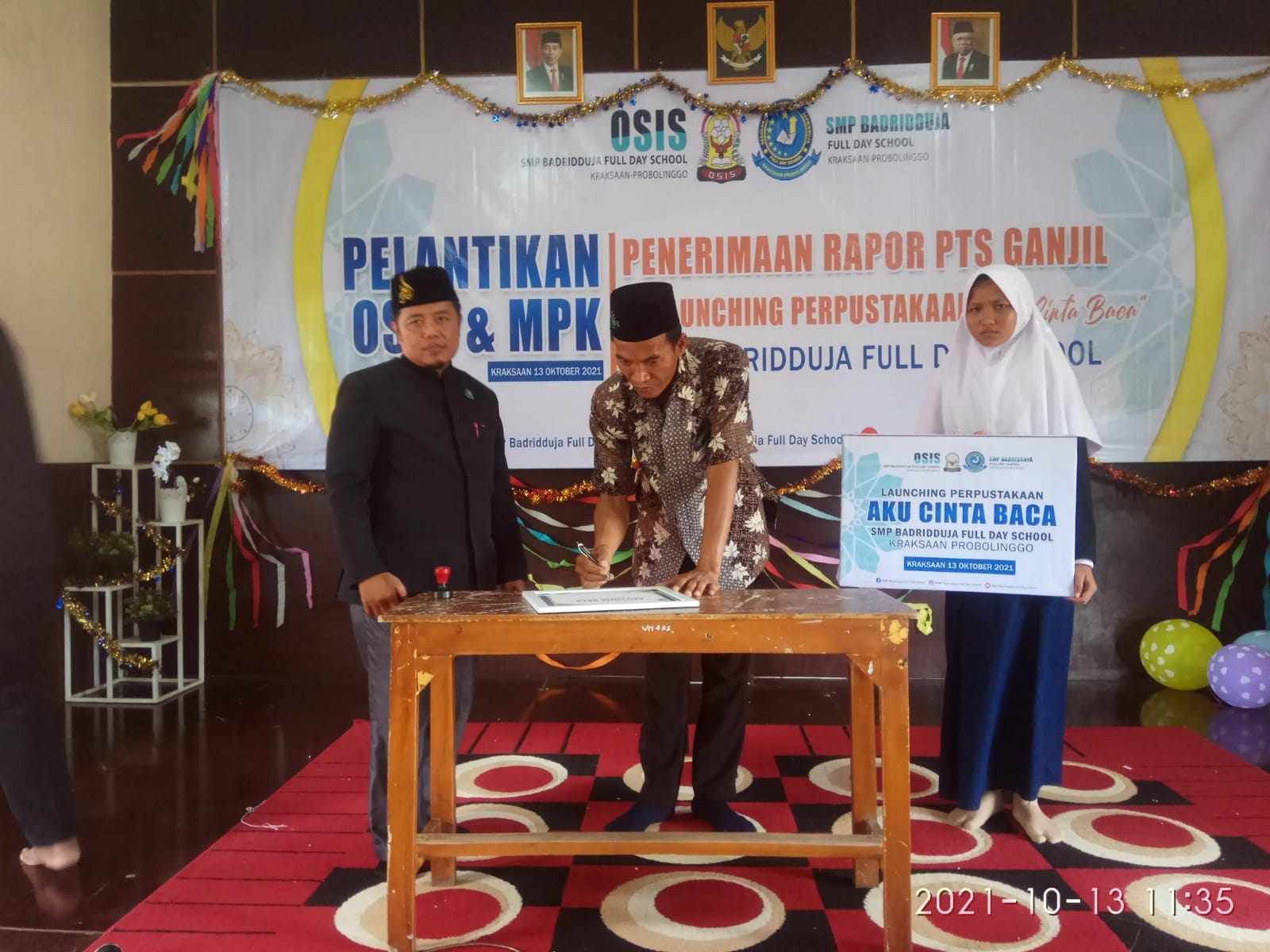 Penandatanganan Prasasti Perpustakaan SMP Badridduja Full Day School Kraksaan oleh Ketua PD-GPMB Probolinggo