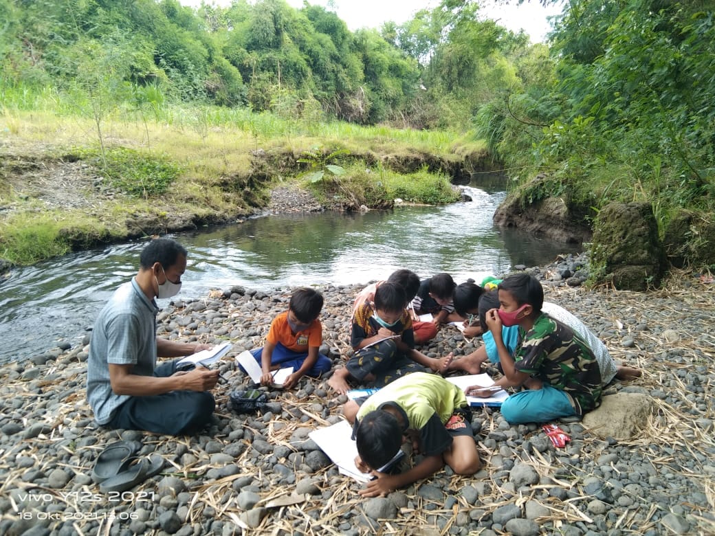 Siang tampak cerah dengan angin sepoi-sepoi dan di sekelilingnya pohon-pohon bambu, daunnya bergoyang-goyang, dan air sungai pun tampak jernih, di Kali Bambu, Desa Kalikajar Wetan, Paiton, Probolinggo, seorang pegiat literasi, Saifullah, membimbing anak-anak usia Sekolah Dasar (SD) untuk belajar menulis cerita.