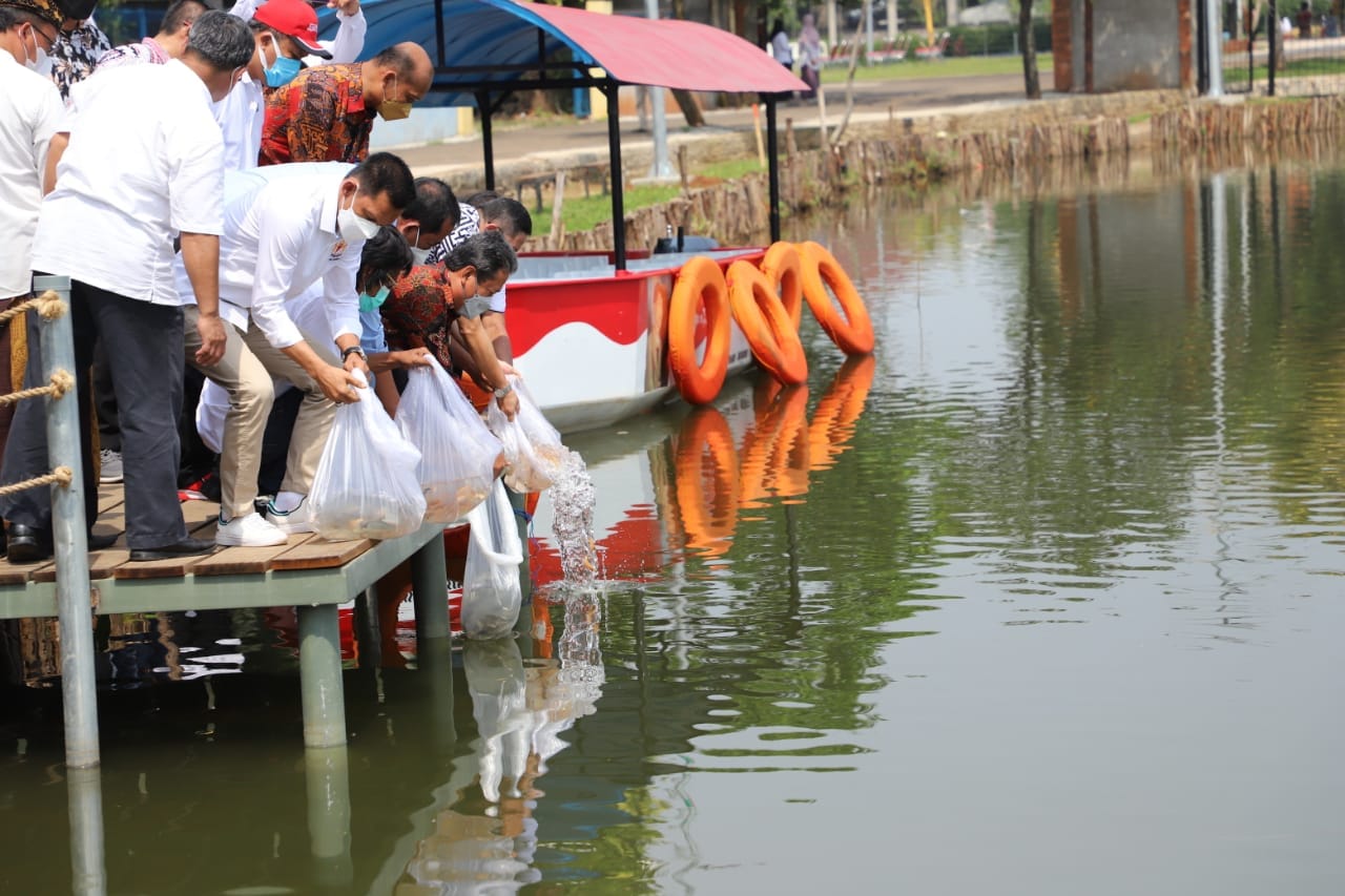 BOGOR, NUSANTARAPOS – Kementerian Kelautan dan Perikanan (KKP) menebar 100 ribu ekor benih ikan nilem dan tawes di Situ Lebak Wangi di Parung, Kabupaten Bogor, Provinsi Jawa Barat. Penebaran benih bertujuan untuk menjaga kelestarian ekosistem situ sekaligus mendukung aktivitas wisata yang sudah berjalan di tempat tersebut.
